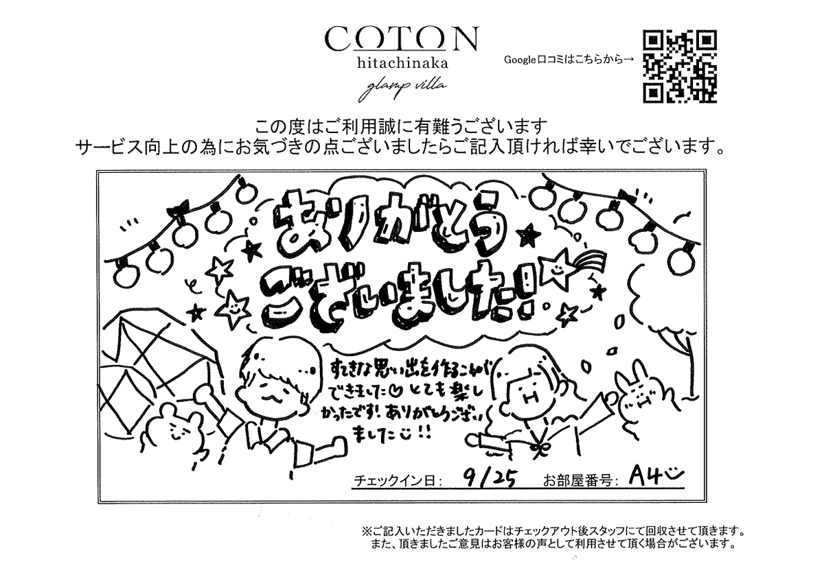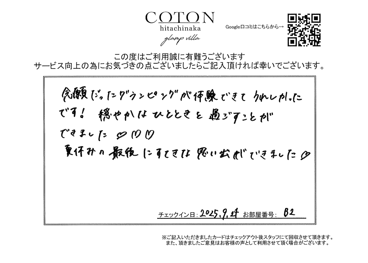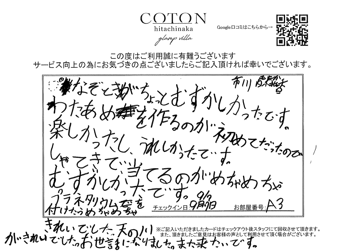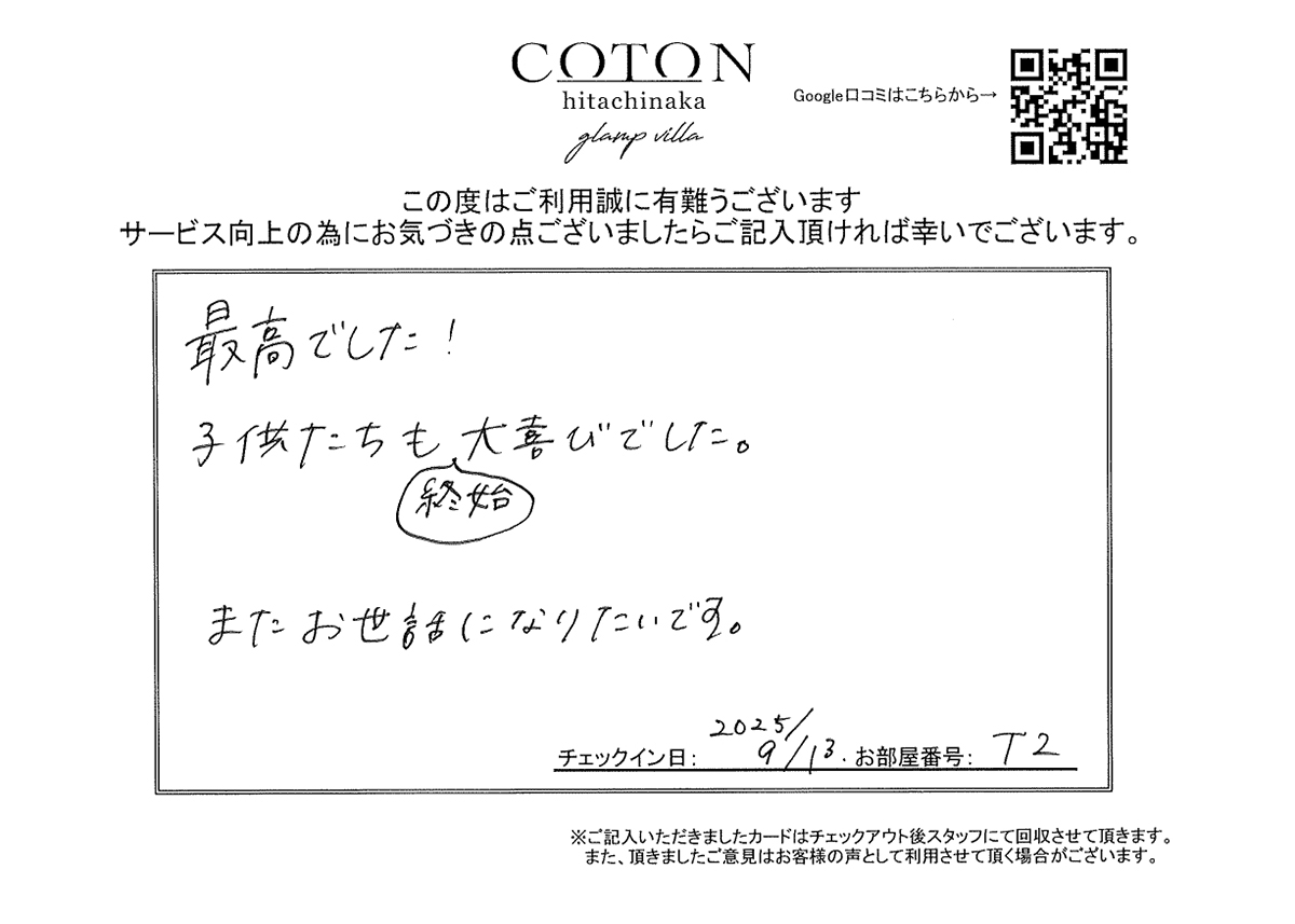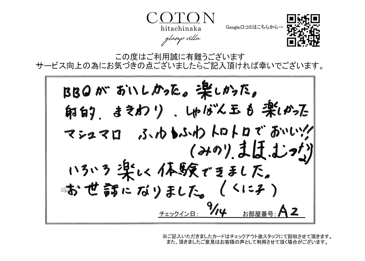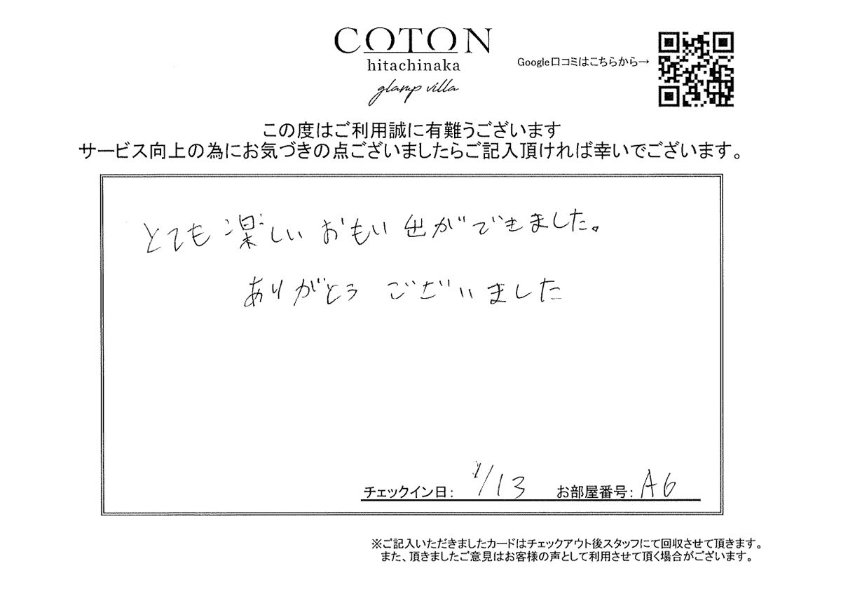 初めてのグランピングにコトンさんを選んで本当に良かったです。とても良い思い出になりました。