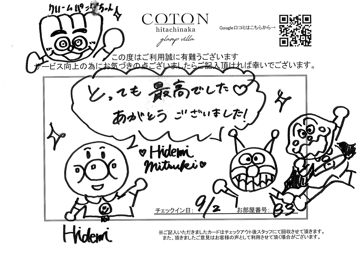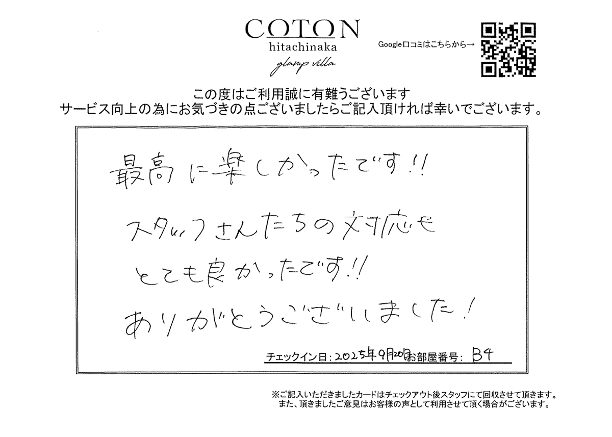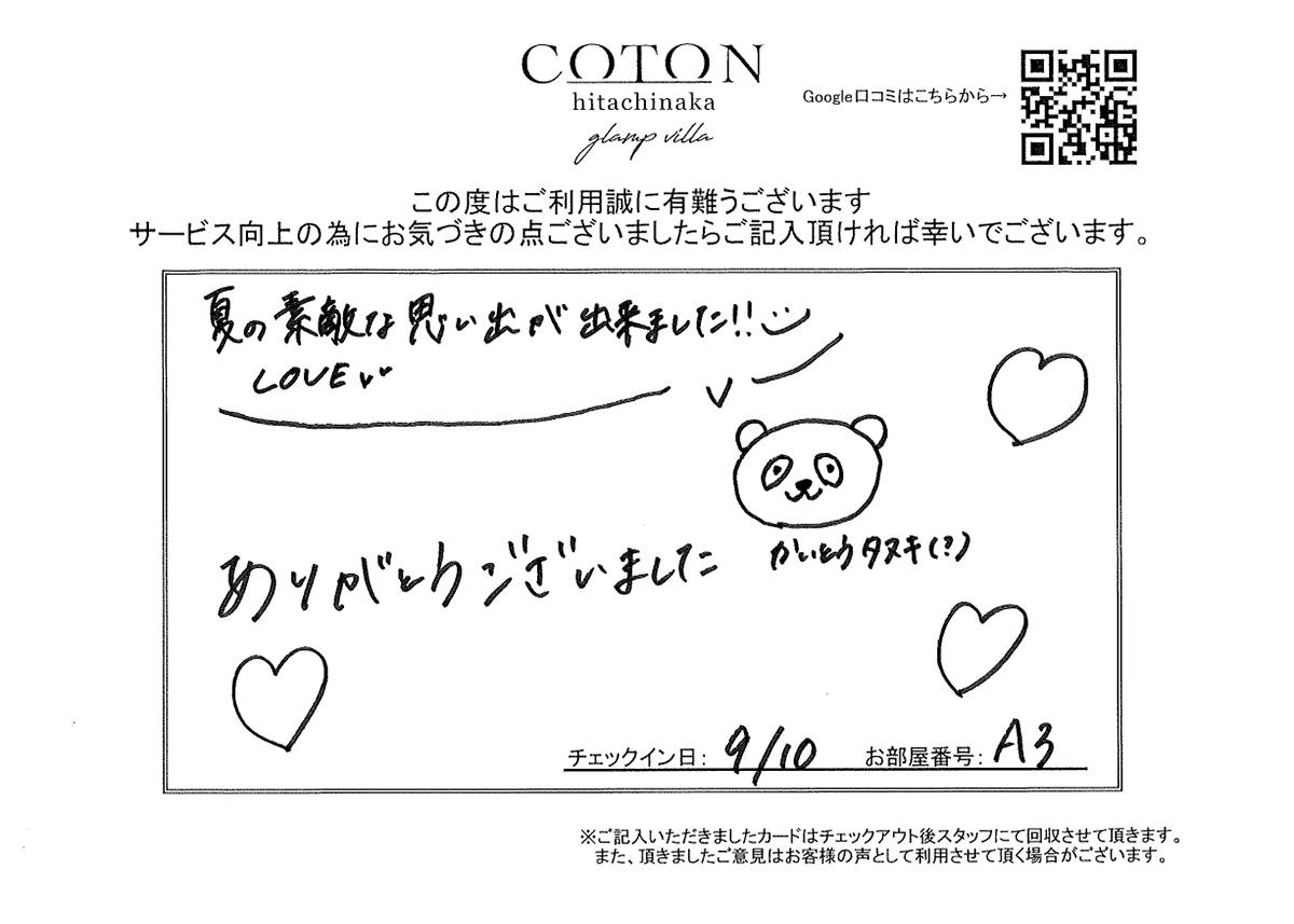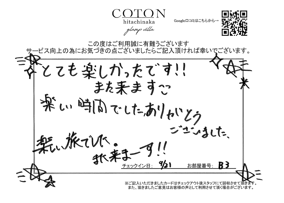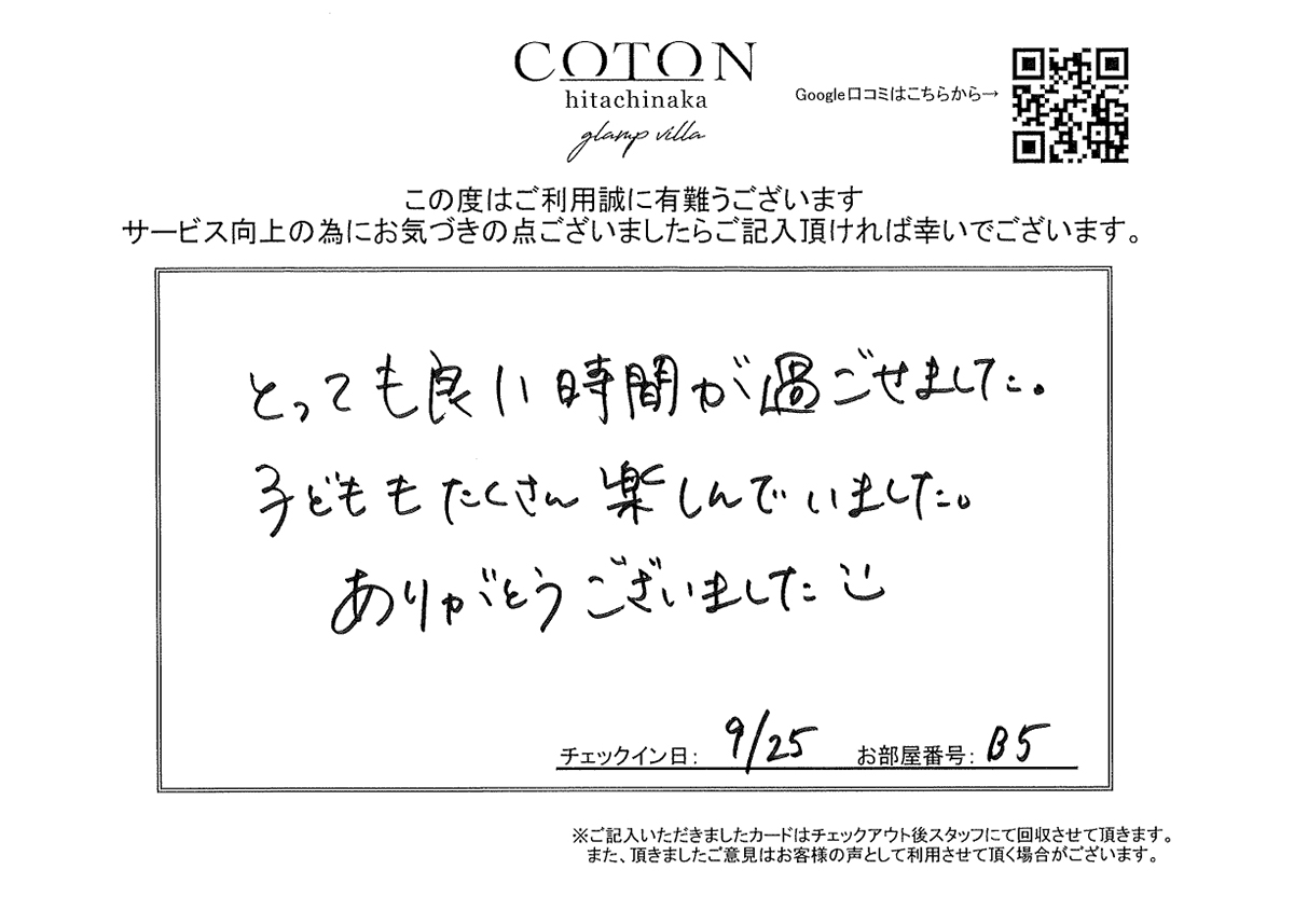 初めてのグランピングにコトンさんを選んで本当に良かったです。とても良い思い出になりました。