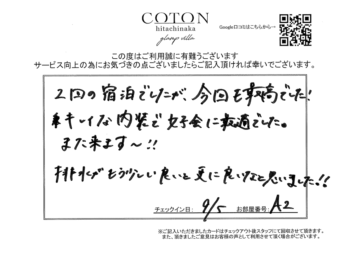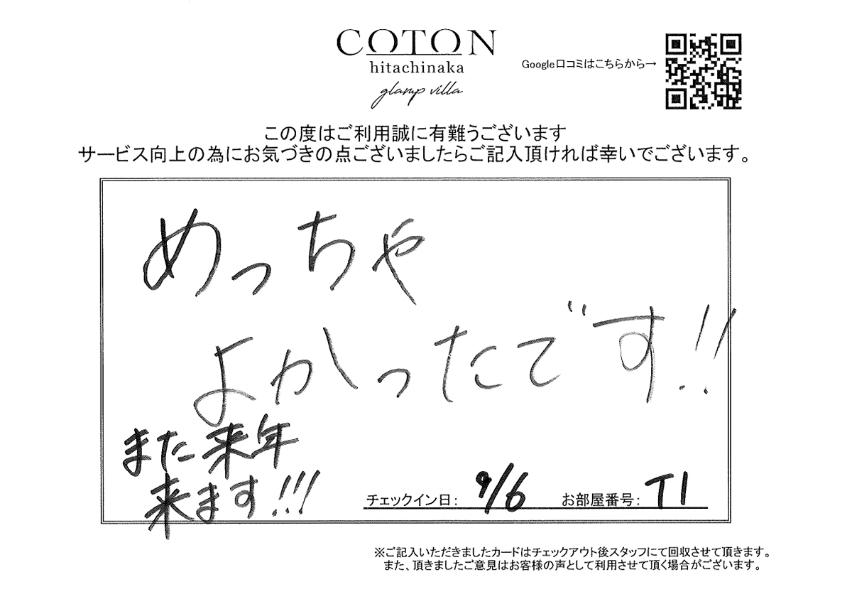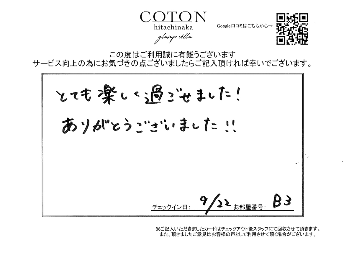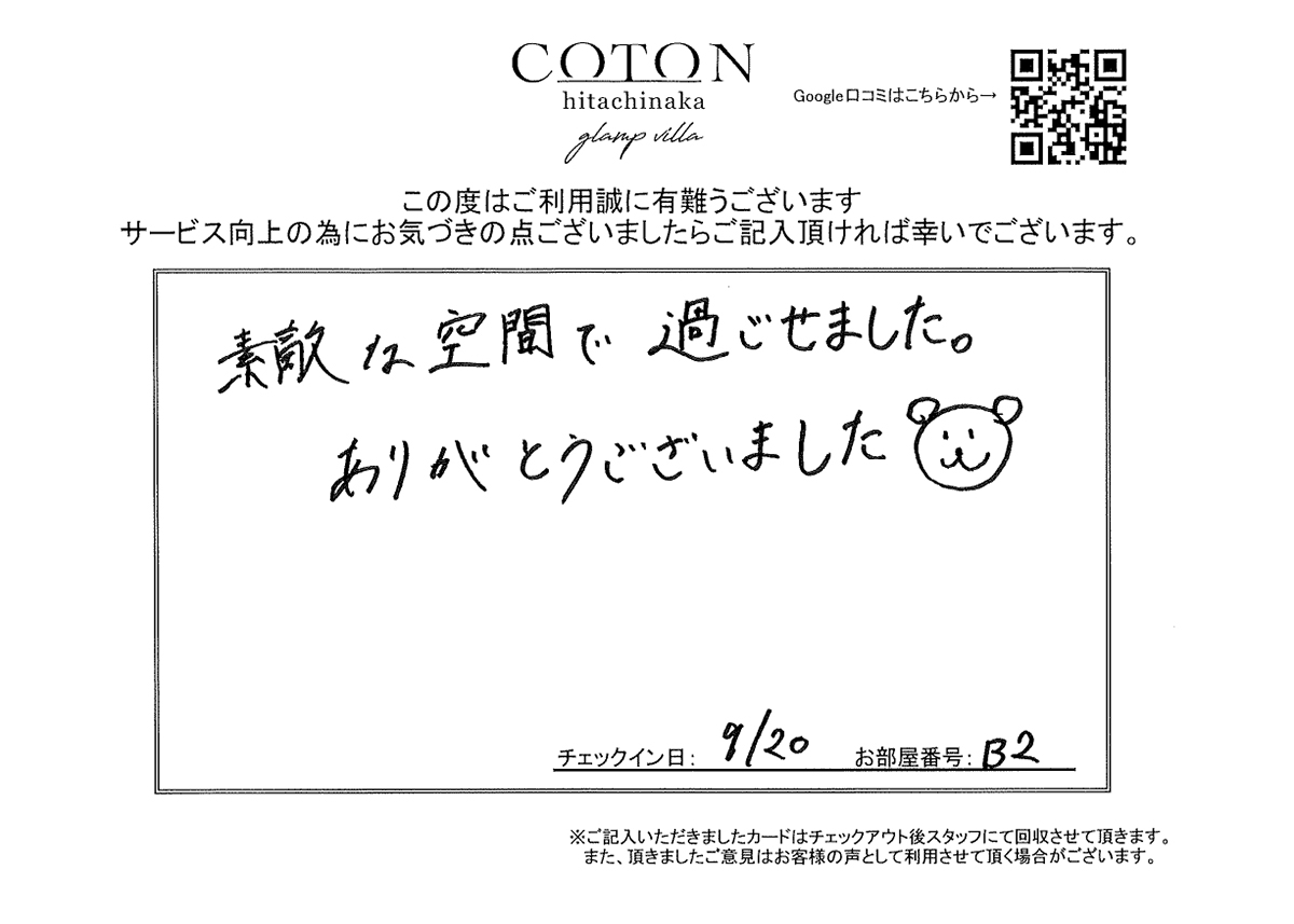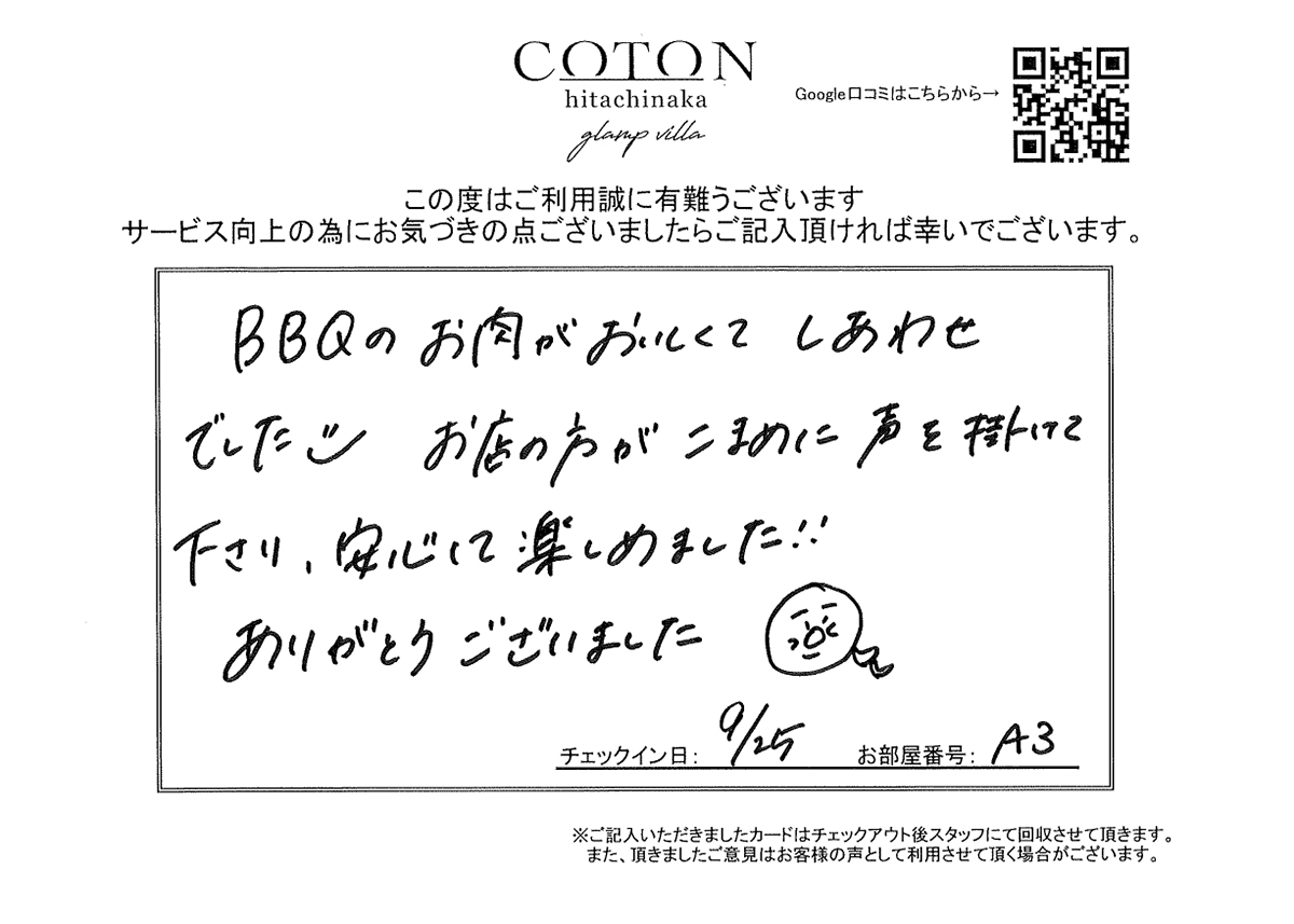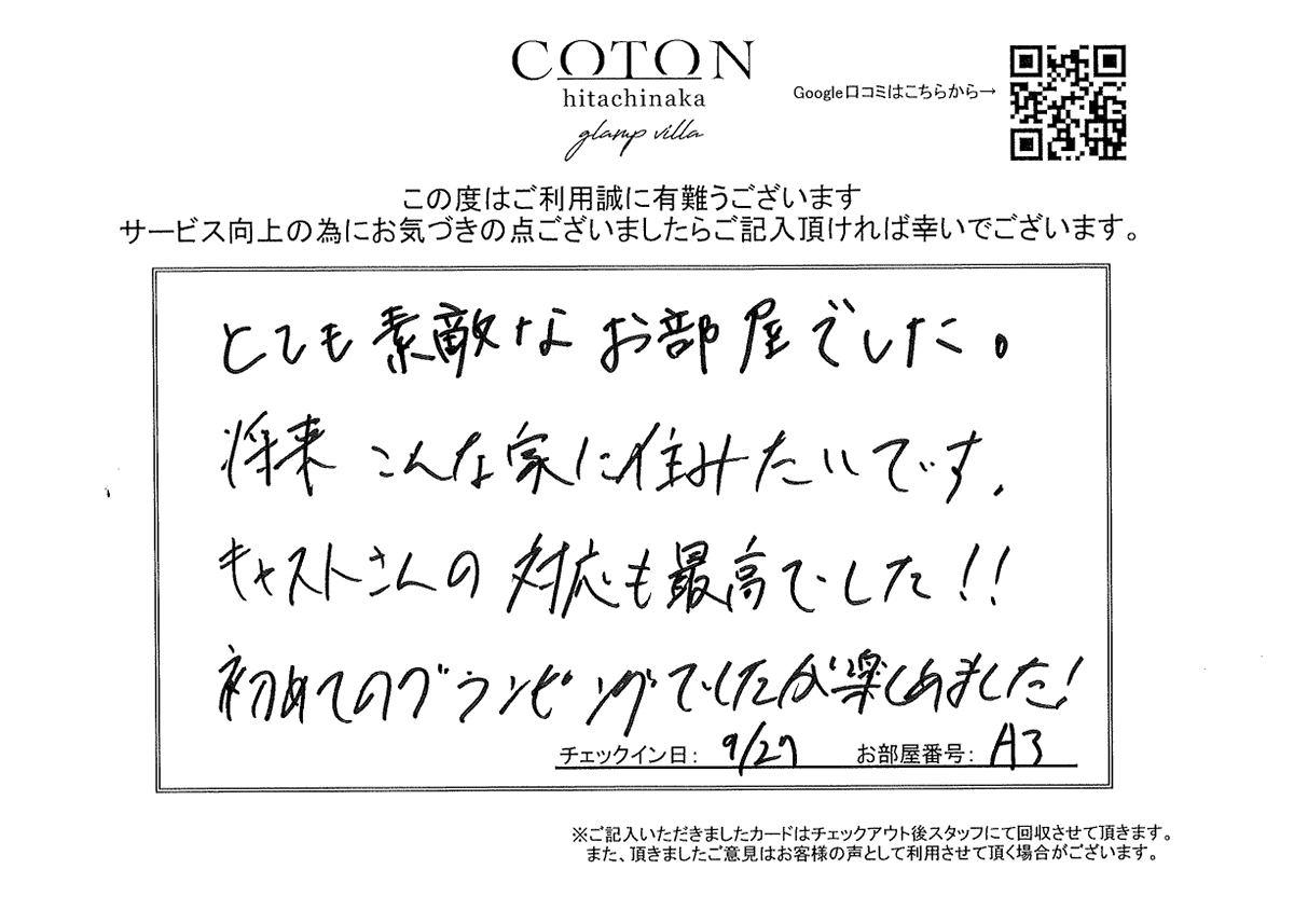 初めてのグランピングにコトンさんを選んで本当に良かったです。とても良い思い出になりました。
