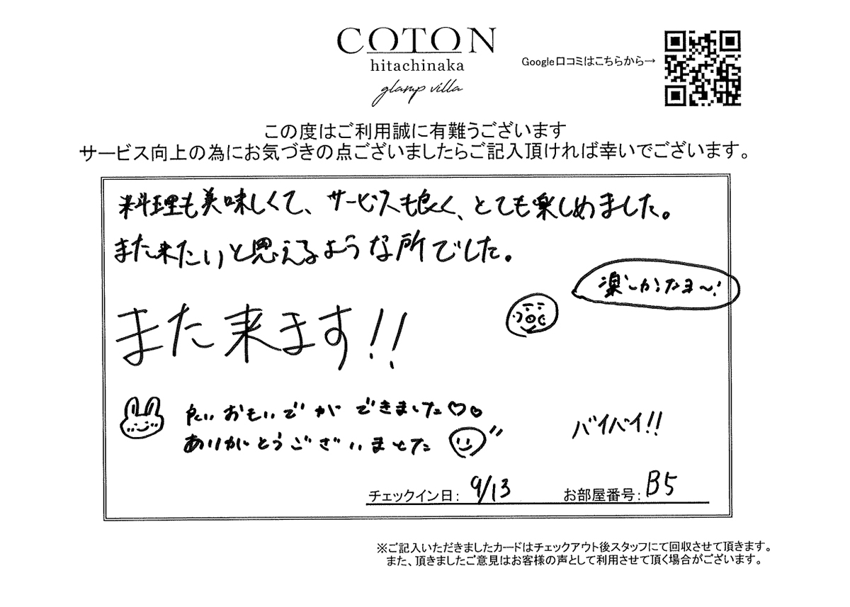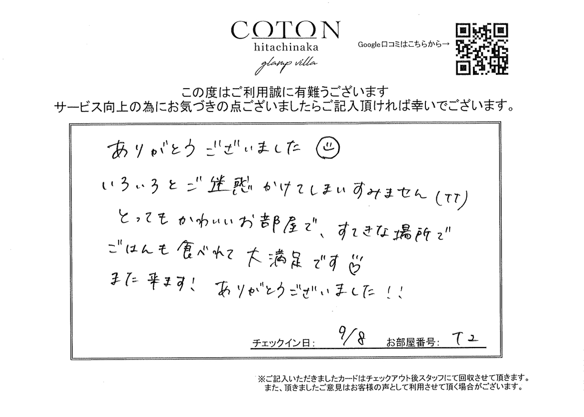 今回は本当にありがとうございました。何もかもがとっても 可愛いし、ご飯もおいしいし…とにかくサイコーでした。