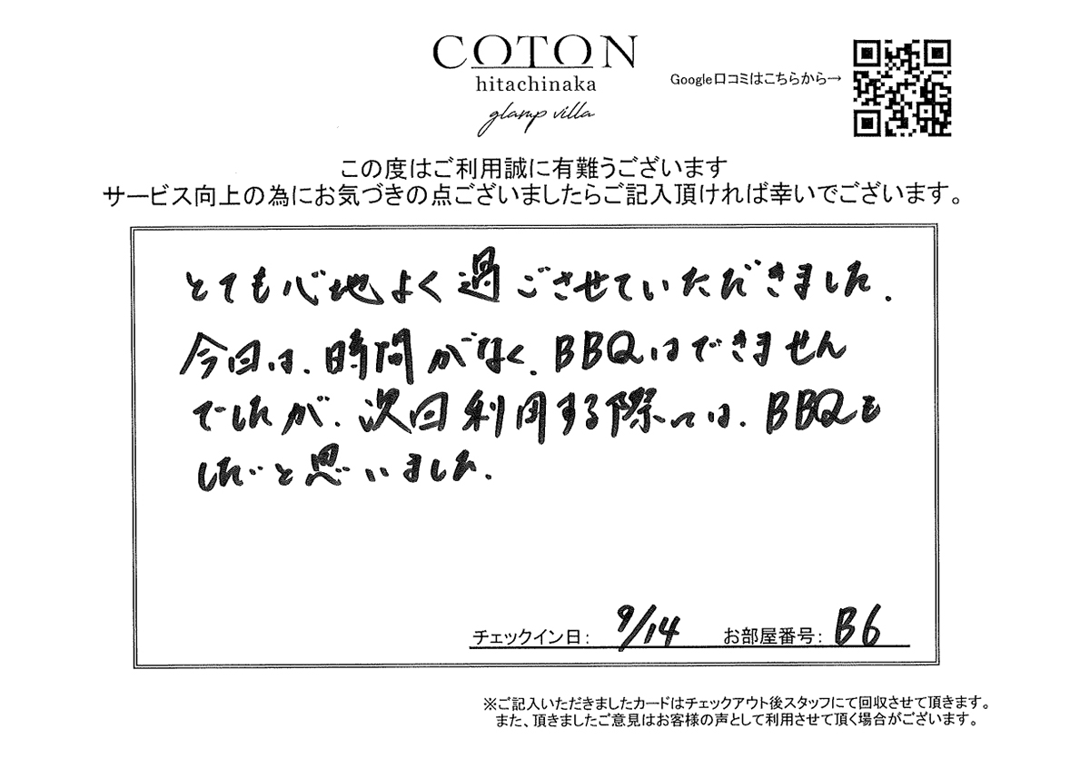 今回は時間がなく、BBQはできませんでしたが、次回利用する際には、BBQをしたいと思いました。
