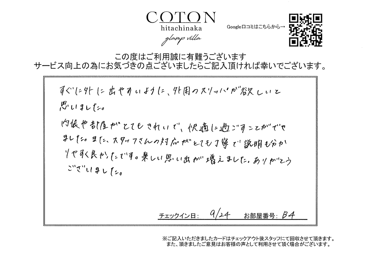 すぐに外に出やすいように、外用のスリッパが欲しいと思いました。