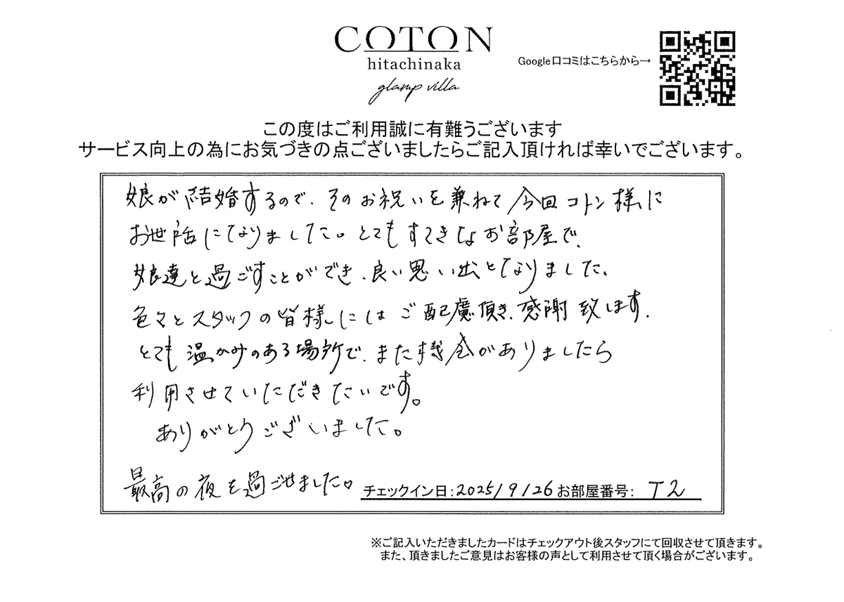 娘が結婚するので、そのお祝いを兼ねて今回コトン様にお世話になりました。