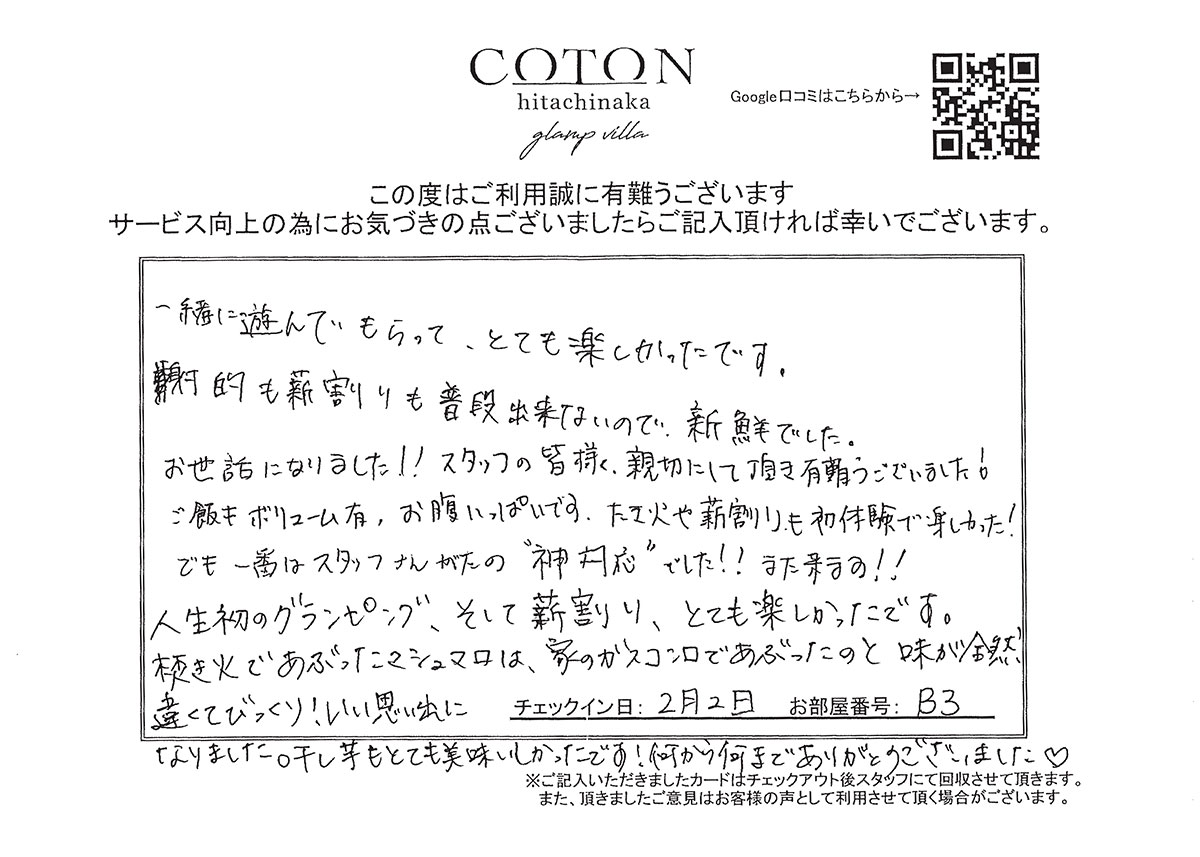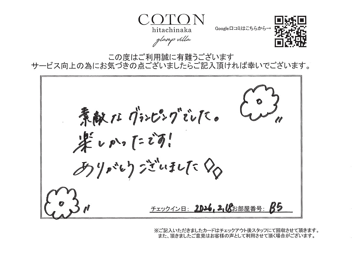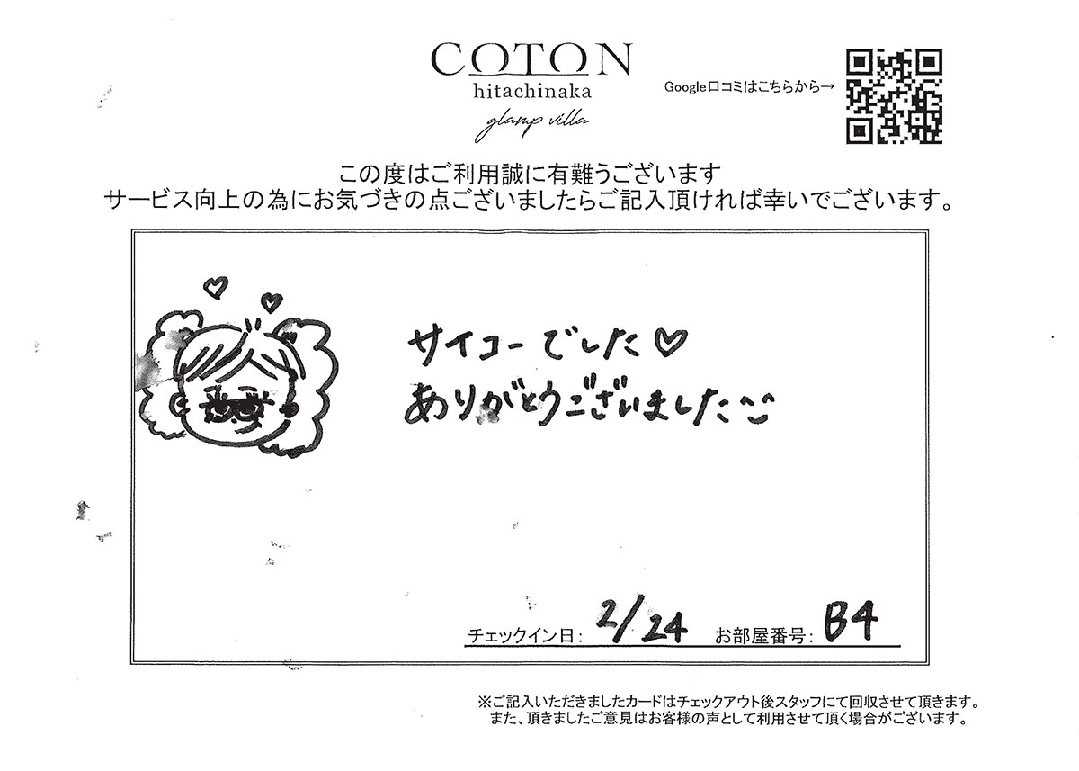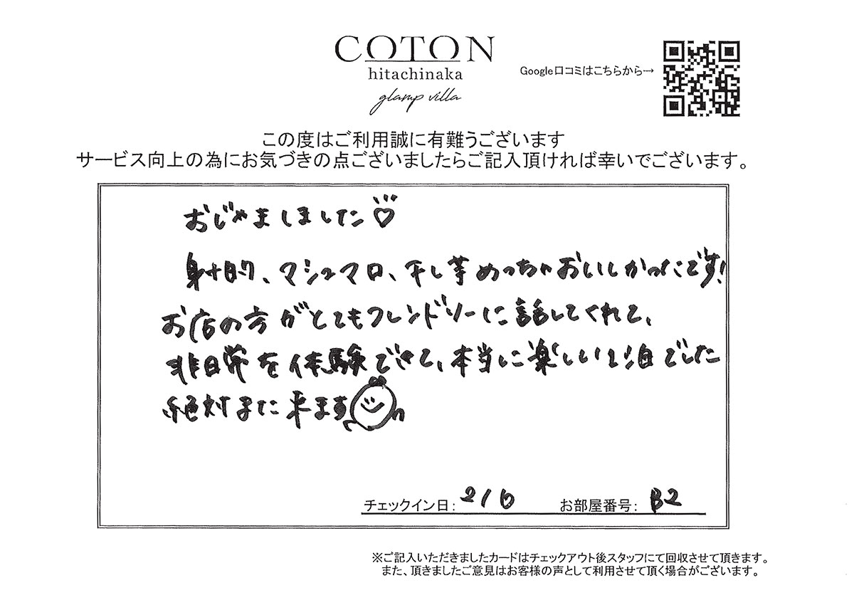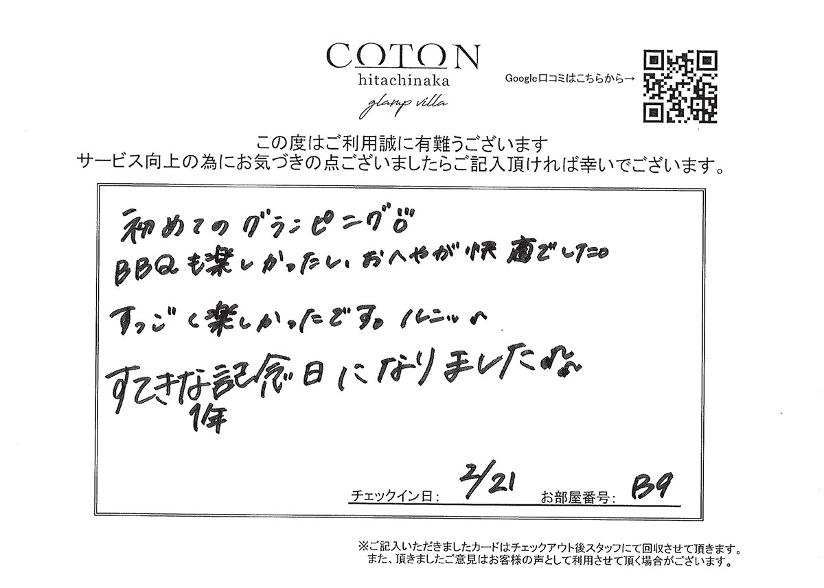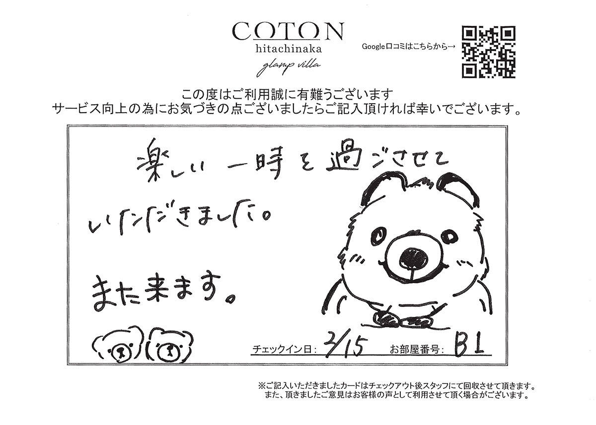 初めてのグランピングにコトンさんを選んで本当に良かったです。とても良い思い出になりました。