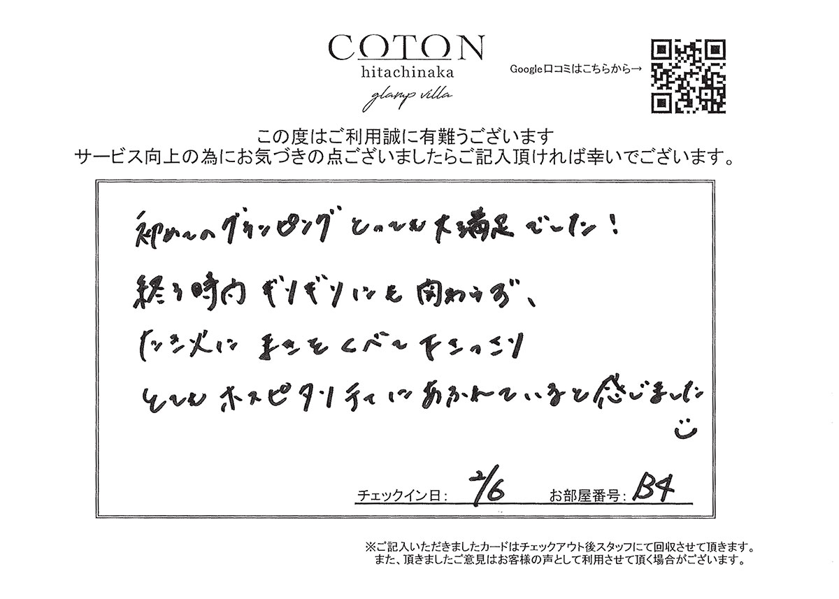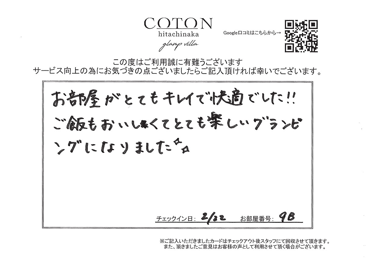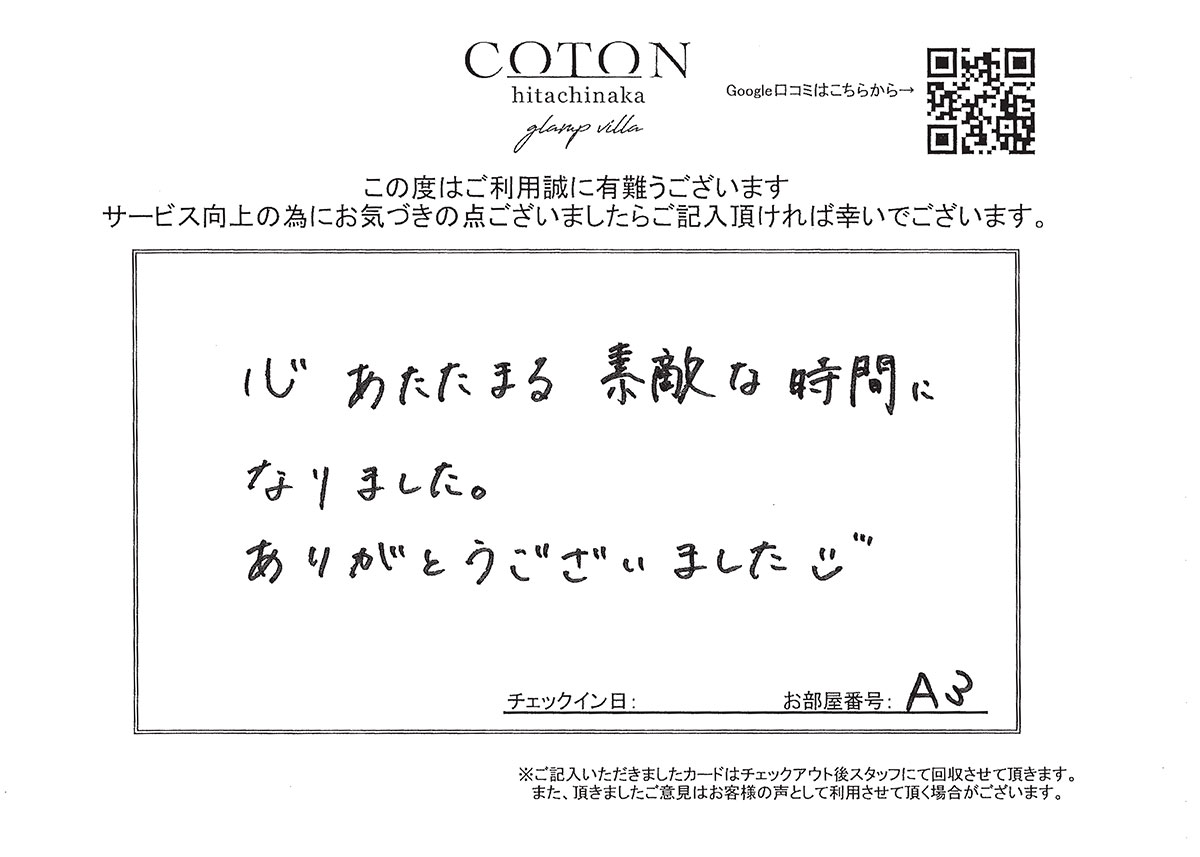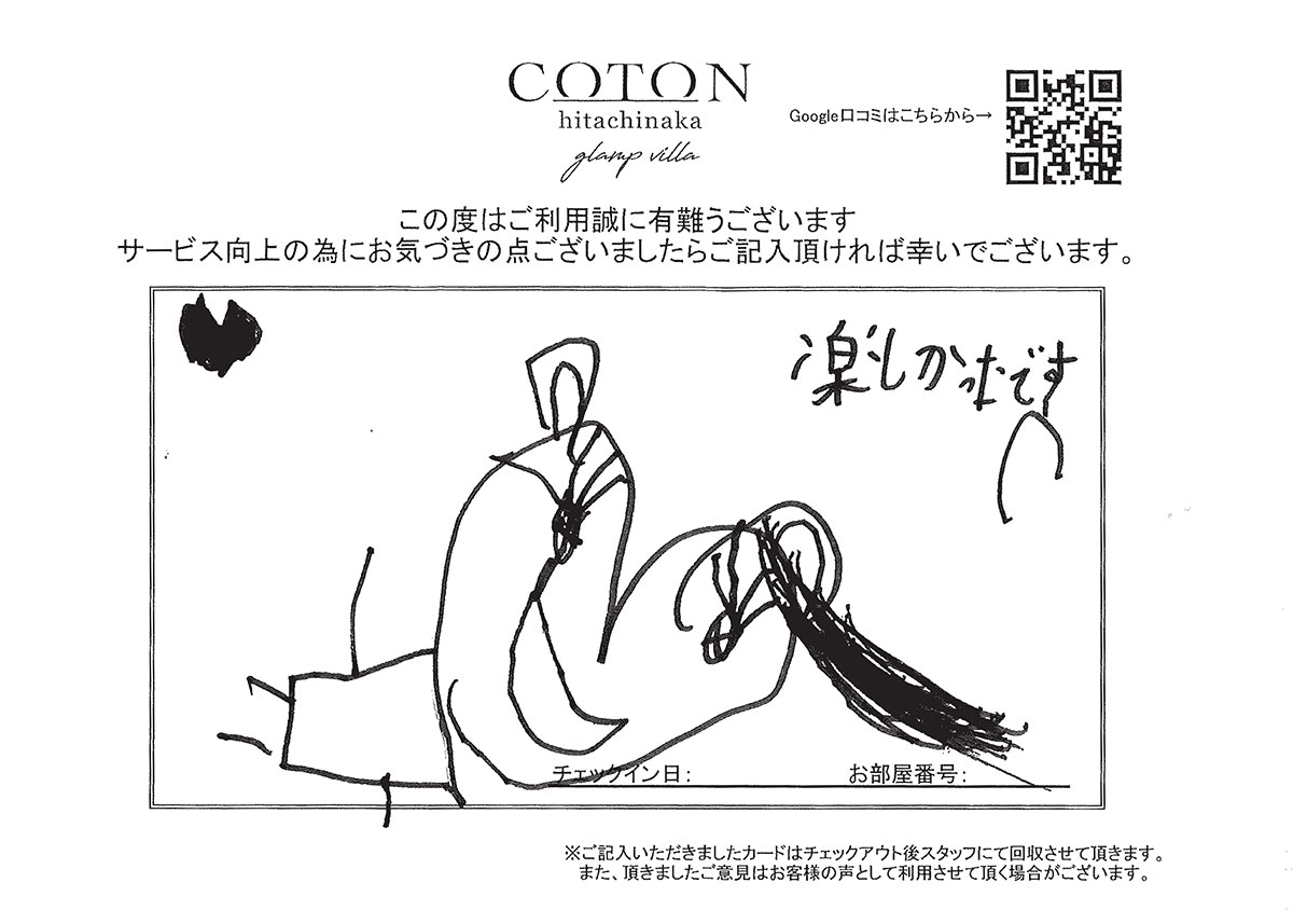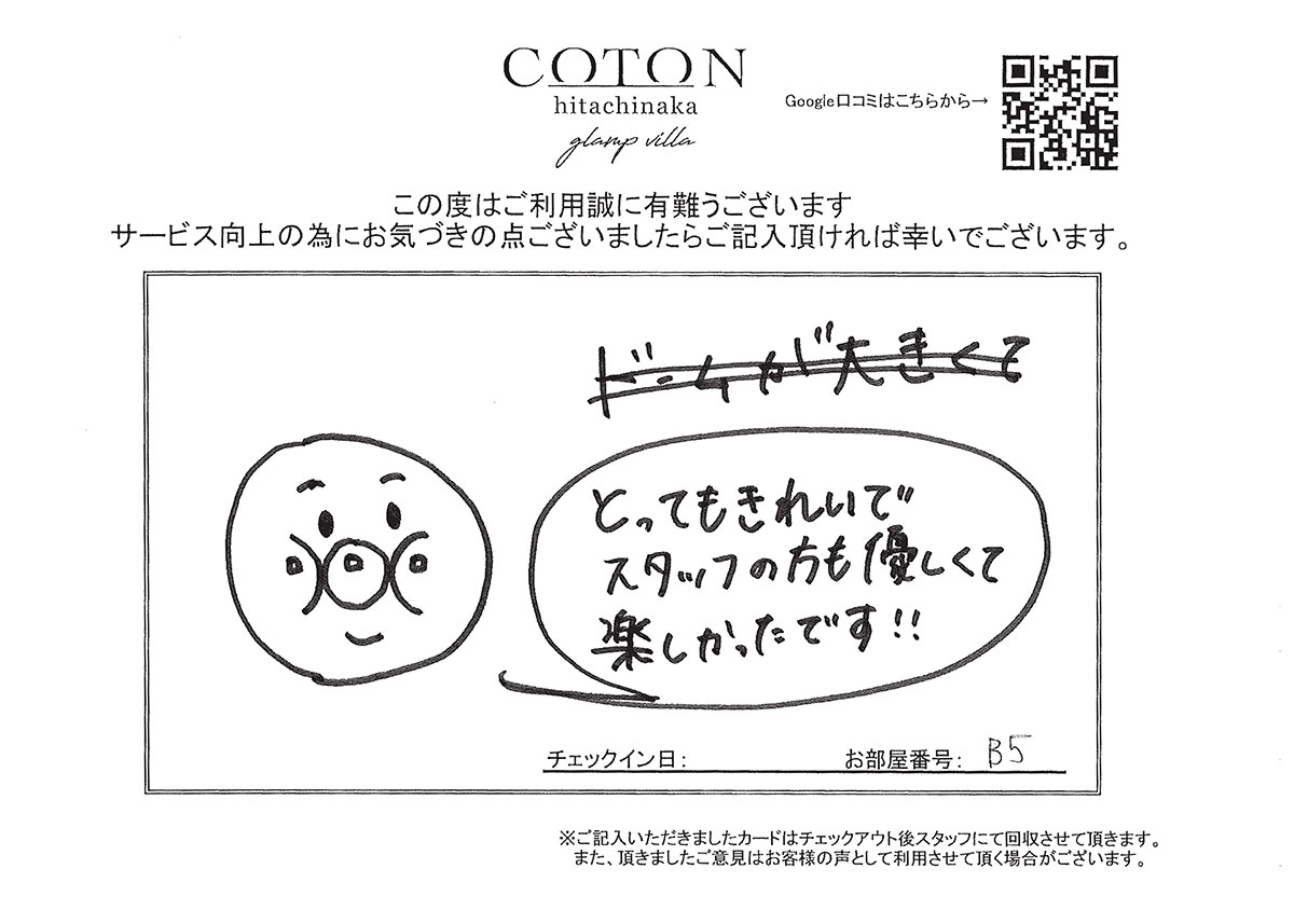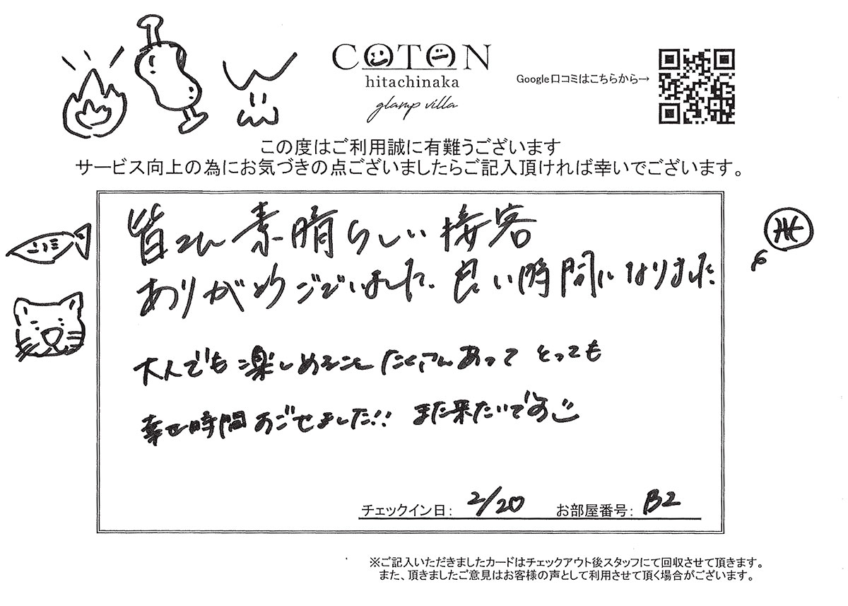 初めてのグランピングにコトンさんを選んで本当に良かったです。とても良い思い出になりました。