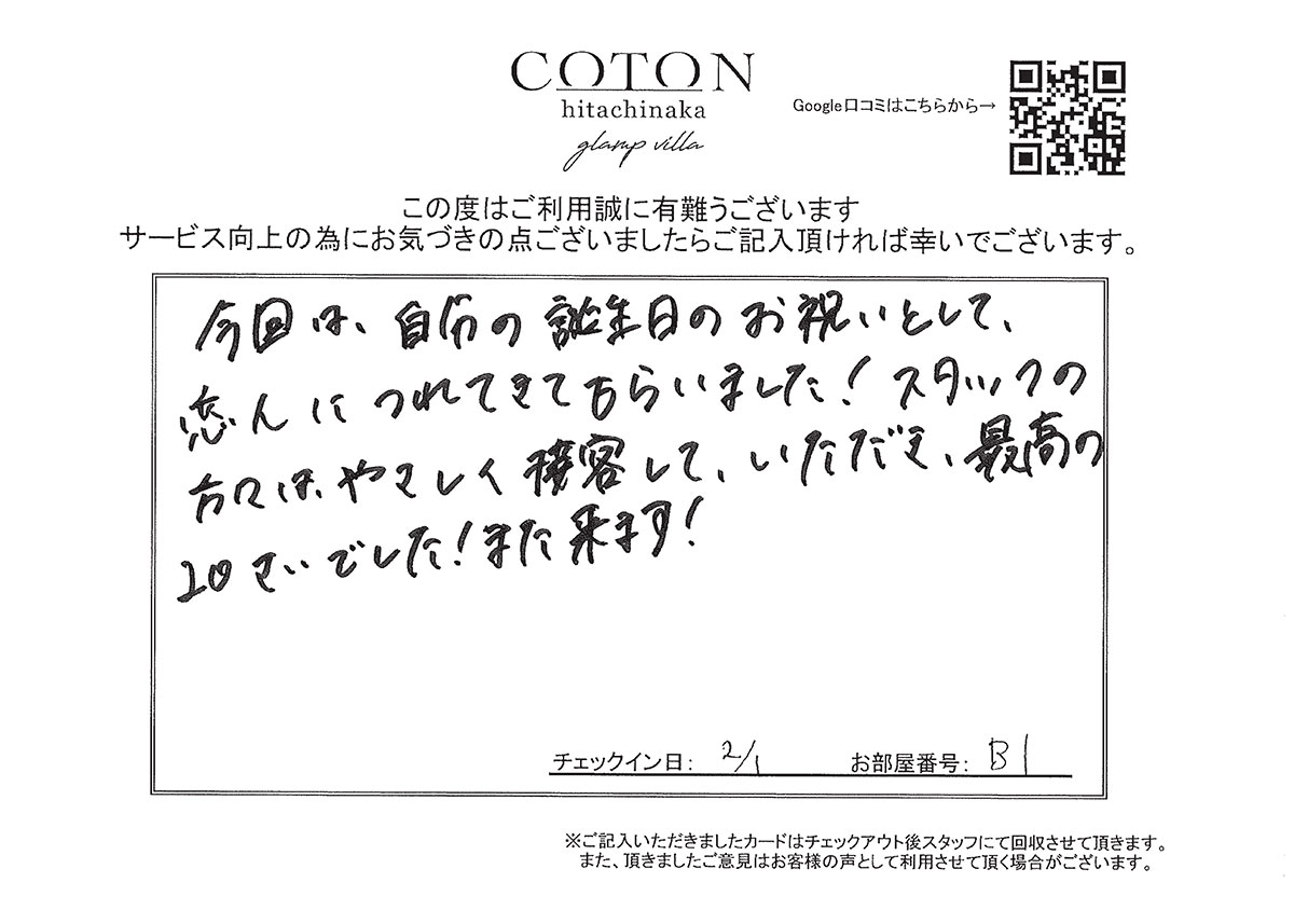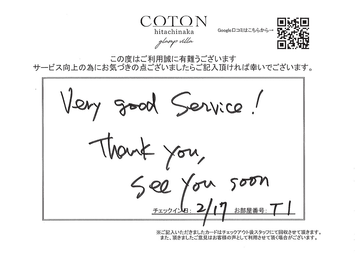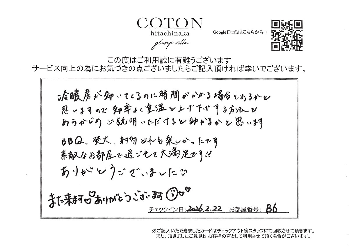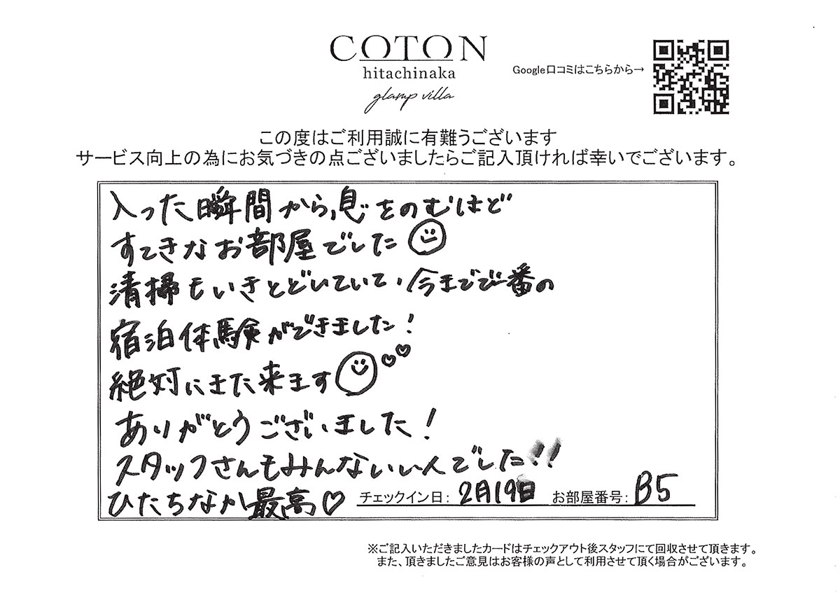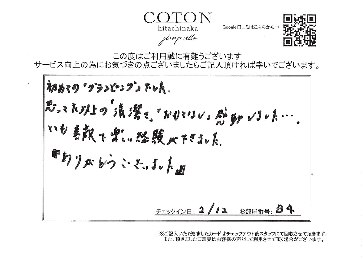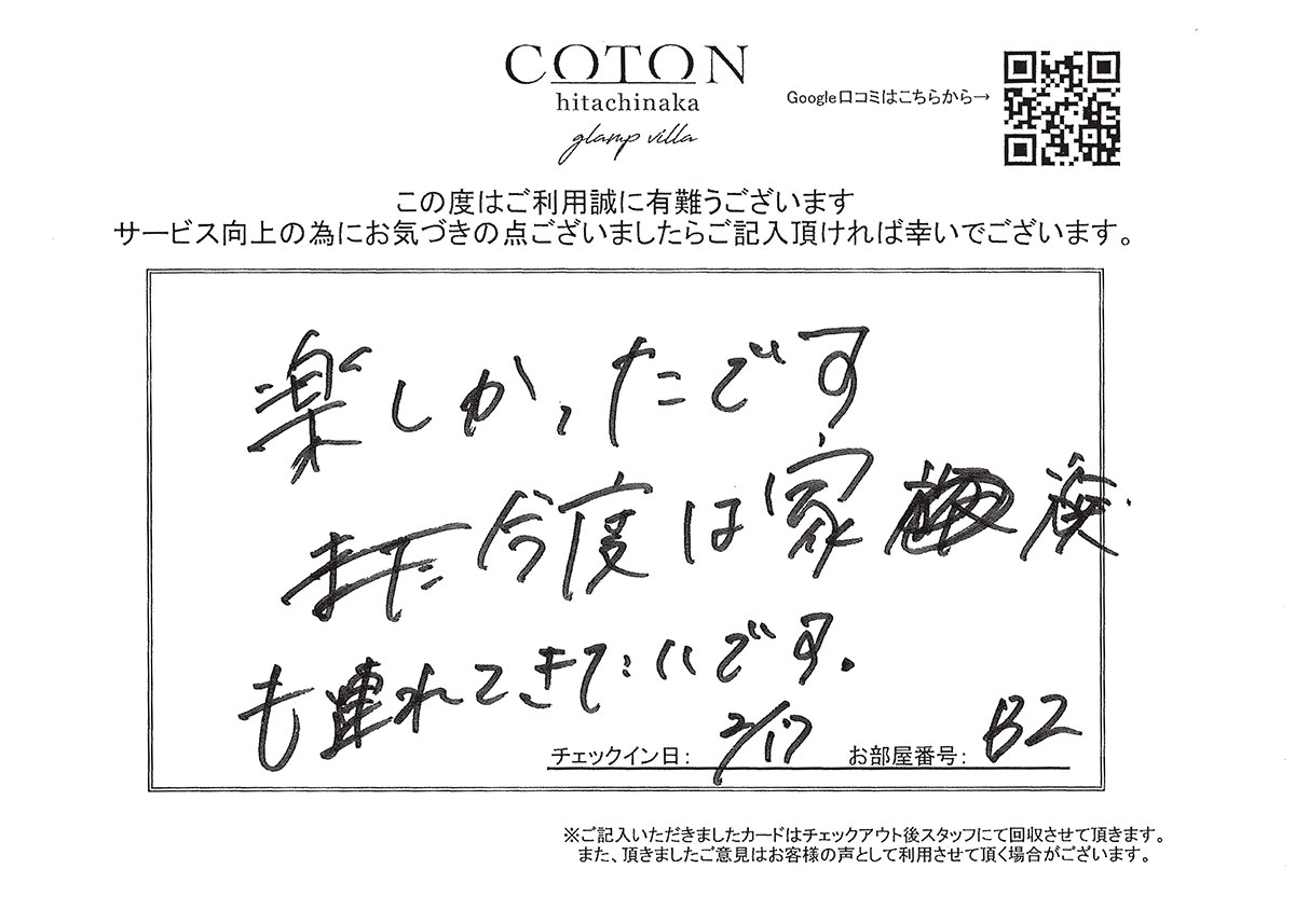 初めてのグランピングにコトンさんを選んで本当に良かったです。とても良い思い出になりました。