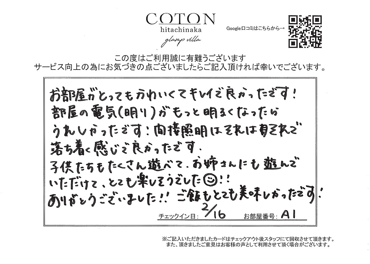 今回は本当にありがとうございました。何もかもがとっても 可愛いし、ご飯もおいしいし…とにかくサイコーでした。