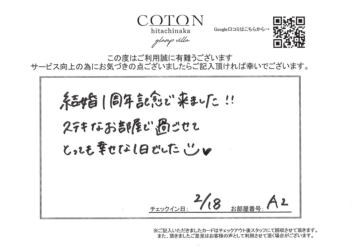 クリスマスが結婚記念日で前祝いも込めてこちらで思い出作りが出来うれしかったです。ツリーの飾りやオシャレなおへや、おいしい料理も 最高でした!!貴重な経験をありがとうございました
