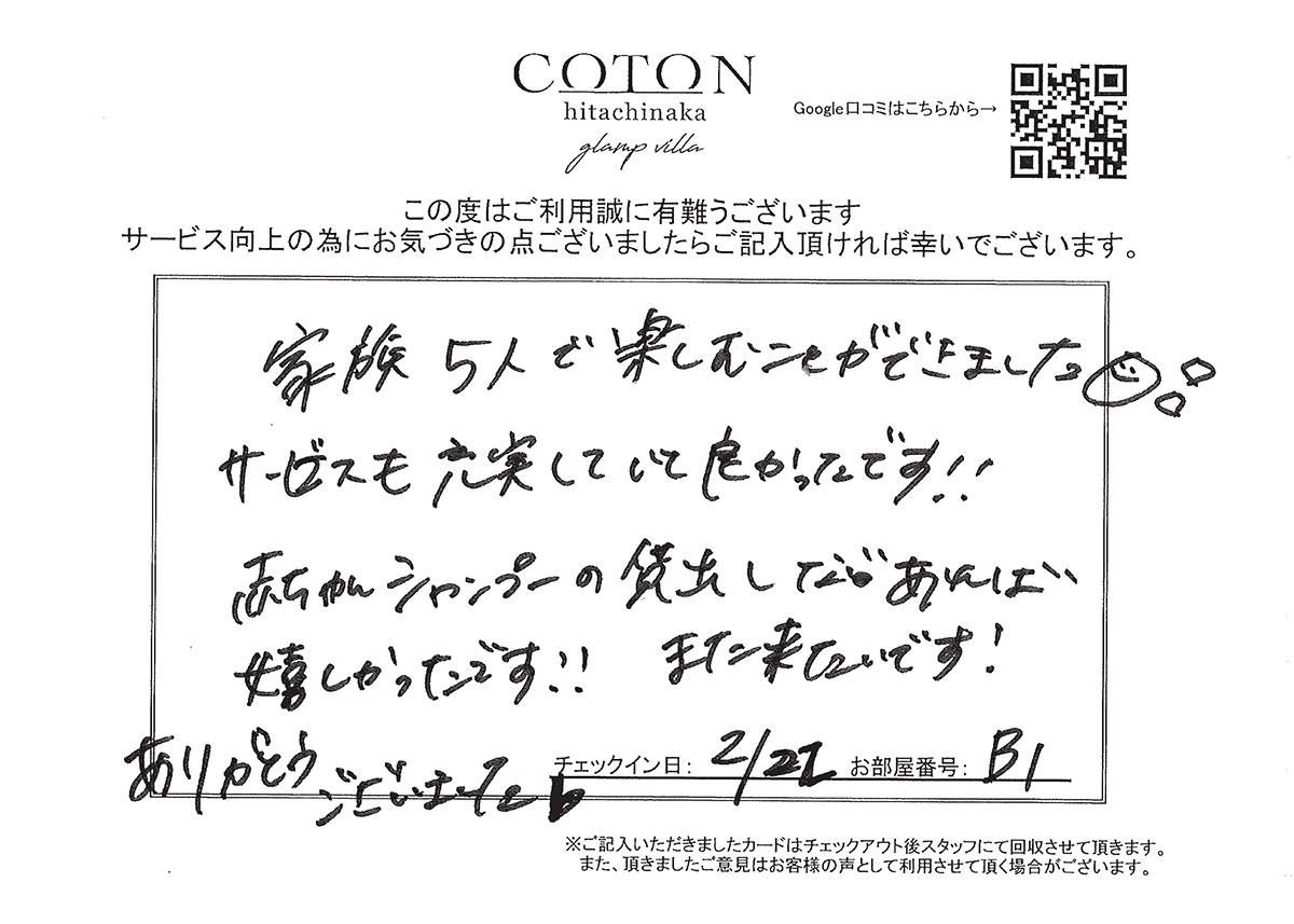 家族の良い思い出になりました。ぜひまた利用したいです!